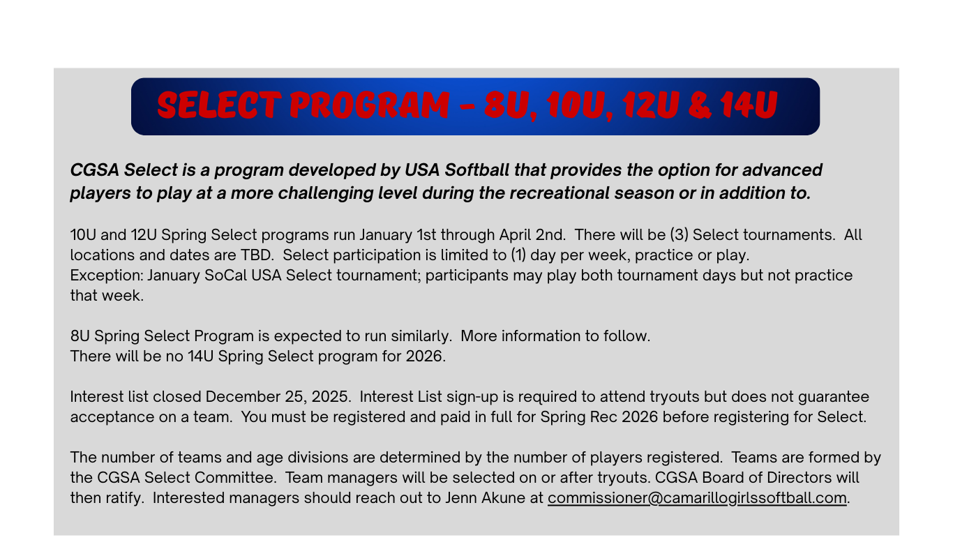 Please click on the link below to see the Select Program Rules and Player Code of Conduct: